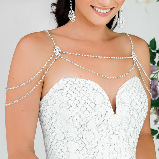 - Shoulder necklaces – dramatic statement pieces that drape across the shoulders for bold, modern brides