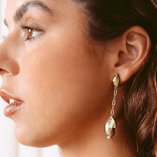 Kyra Gold Crystal Chain Drop Earrings - Navette Stud Draped Earrings