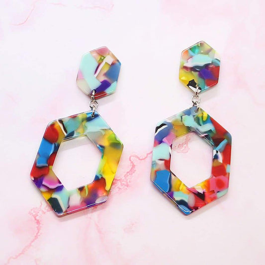 Prismatic Rainbow Hexagon Earrings | Colourful Acetate Statement Jewellery
