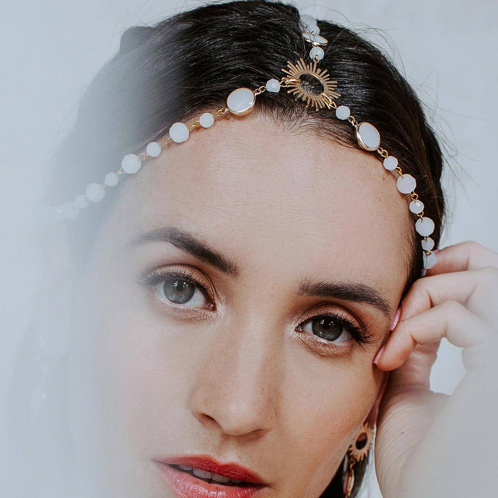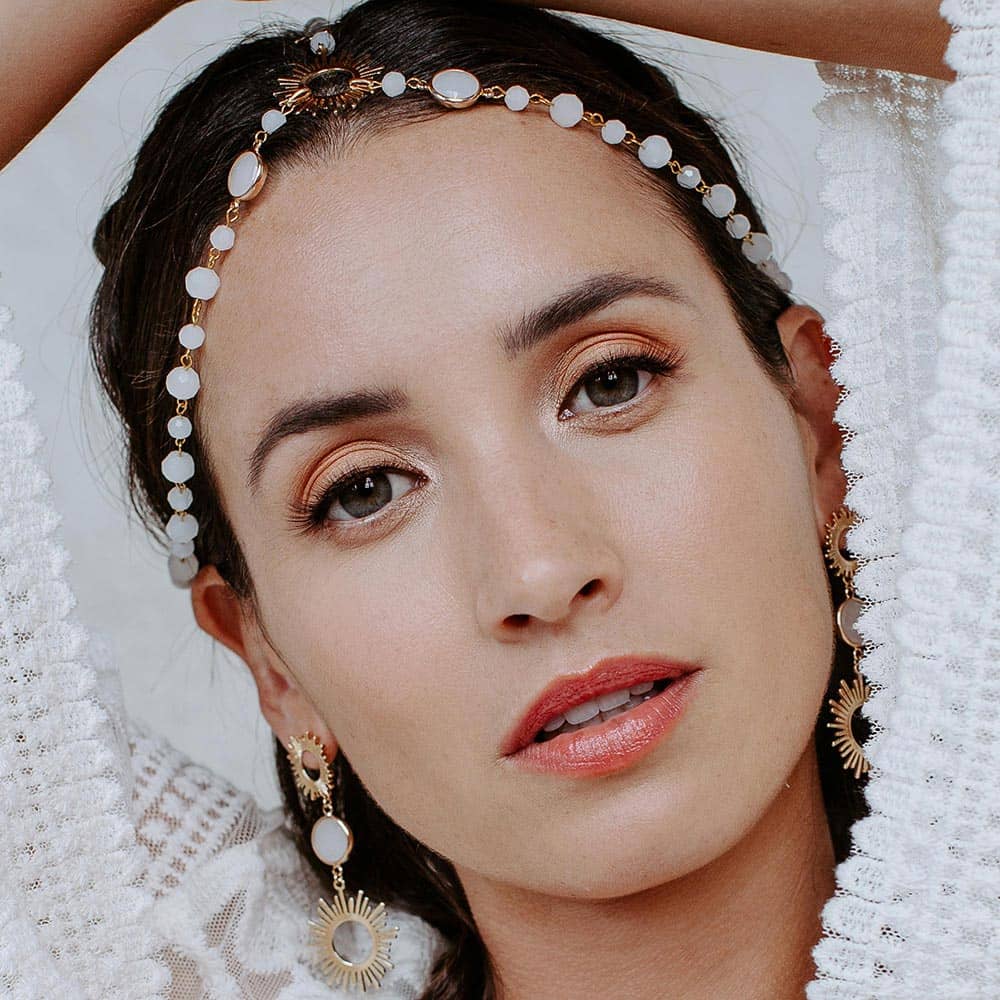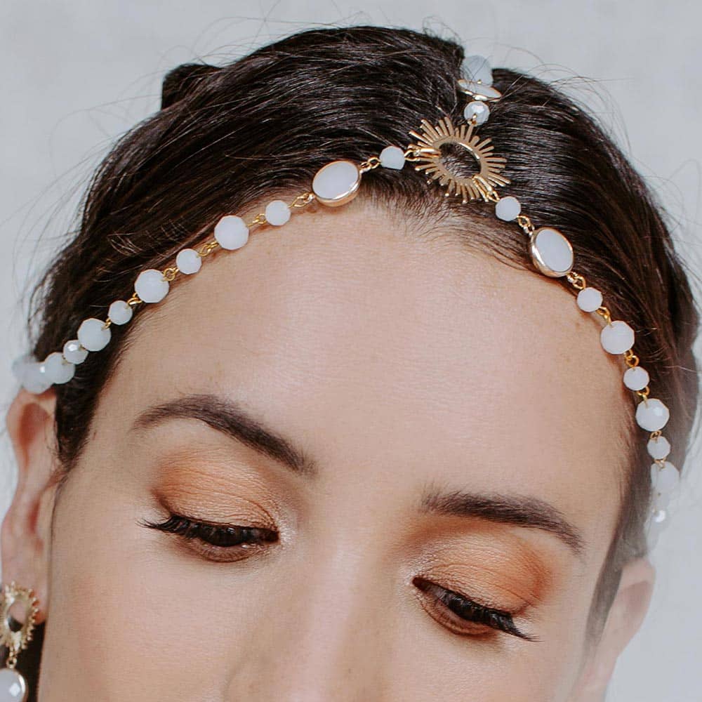 This bohemian headpiece will have you gleaming like the sun & radiating your raw wild side. White jade coloured glass beads & gold chains drape around the head with a sun charm floating above your forehead.